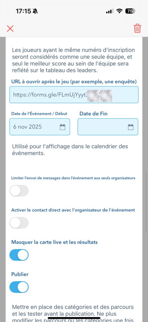 Dans le champ « URL à ouvrir après l’activité », saisissez l’URL de la page que vous souhaitez afficher (HTTPS recommandé). Exemple : URL d’un questionnaire Google Forms.