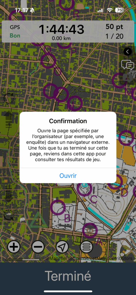 Une fois la partie terminée et lorsque le participant appuie sur « Terminé », un message s’affiche. Ce message l’informe que l’URL spécifiée par l’organisateur de l’événement s’ouvrira dans un navigateur externe.