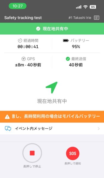 - ステータス表示:経過時間・バッテリー残量・GPS精度・最終送信時刻を自分の画面で確認できます。